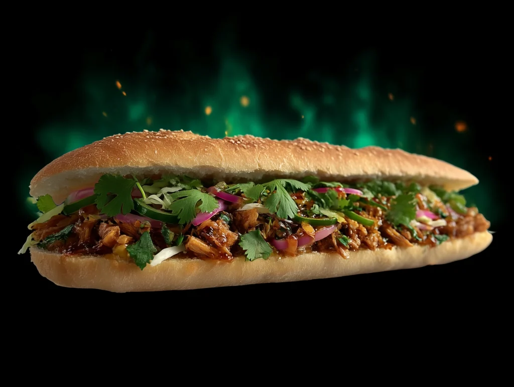Sandwich vietnamien à base de viande marinée au choix ( Poulet Seishin, Poulet Charsui, Porc Teriyaki, Bœuf Nikkei), carottes, concombre, pickles d’oignons rouges, mayonnaise maison et coriandre.