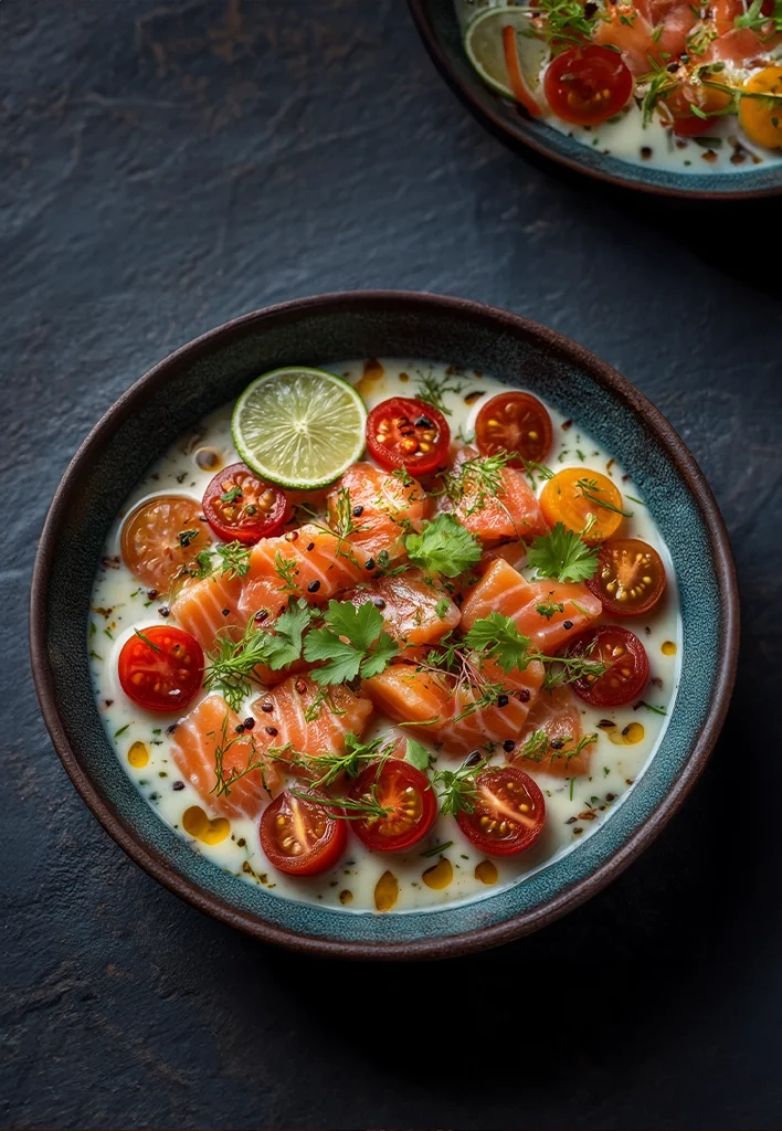 Laissez-vous tenter par une salade rafraîchissante façon ceviche, où la truite saumonée de la vallée de Baigorry, marinée dans un mélange jus de citron vert et lait de coco, s’harmonise avec des crudités croquantes, une touche de ciboulette thaï, des tomates cerises juteuses et une note parfumée de coriandre, le tout servi sur un lit de riz froid délicat.